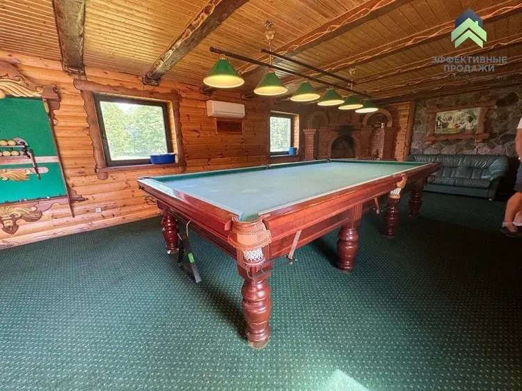 - Помимо самого коттеджа, на участке располагается великолепная баня с комнатой отдыха, где можно расслабиться и поиграть в бильярд.