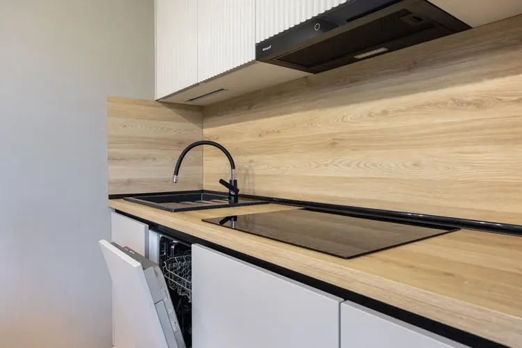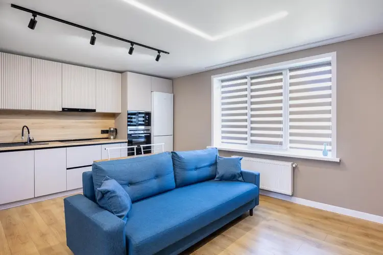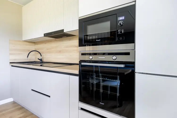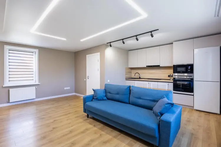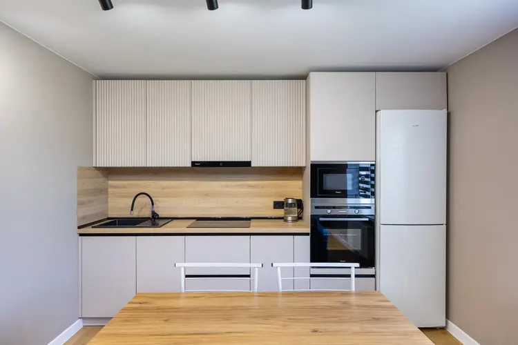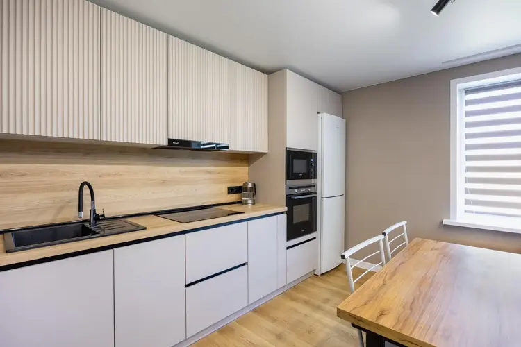 Идеальное место для семейных ужинов и встреч с друзьями. Оснащена техникой Weissgauff (варочная панель, духовой шкаф, вытяжка, СВЧ), посудомоечной машиной Maunfeld, холодильником Atlant. Уют дополняют обеденная зона, диван и ТВ.