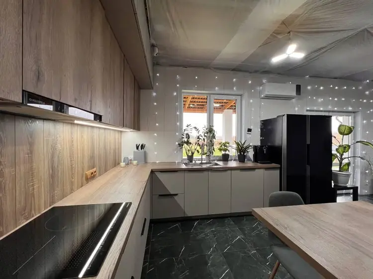 Кухня оборудована стильным гарнитуром с качественной фурнитурой и всей необходимой техникой, (индукционная варочная панель, духовой шкаф, встроенная микроволновая печь, посудомоечная машина, раковина со встроенным измельчителем, вытяжка, объемный двухкамерный холодильник). Установлена сплит система (кондиционер) для охлаждения и очистки воздуха в жару и подогрев в межотопительный период. Подключена система «умный дом с Алисой».