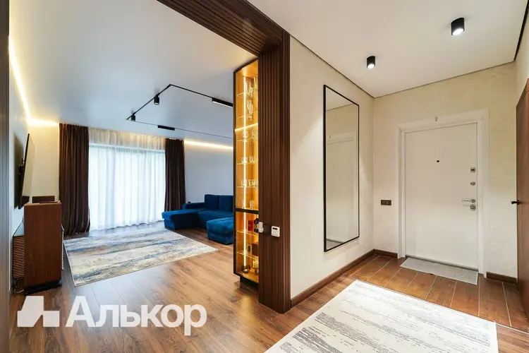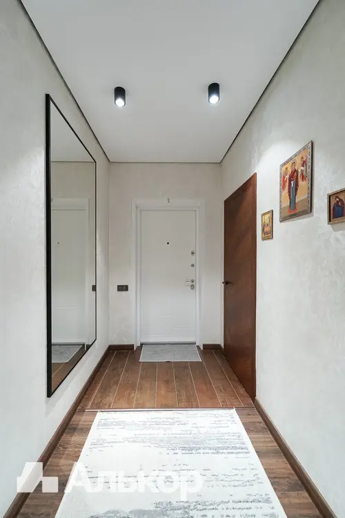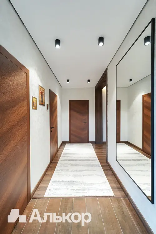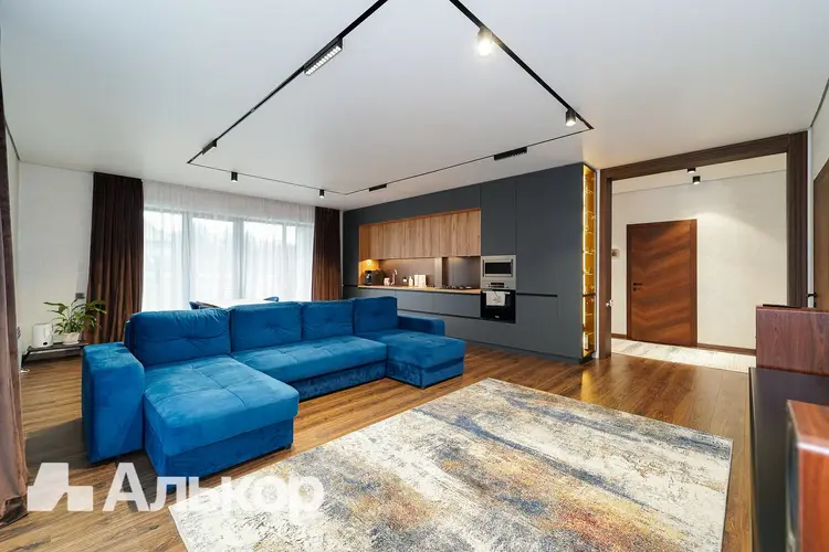 Внутреннее пространство оформлено с использованием высококачественных материалов: полы покрыты ламинатом Egger 33 класса, электрика выполнена по стандартам Schneider, а двери — из натурального шпона со скрытыми петлями, добавляя элегантности и стиля.