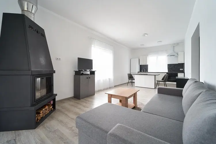 Имеется современная печь-камин. Она создает уютную атмосферу живого огня и может использоваться для обогрева. Выход на просторную террасу, где можно проводить время на свежем воздухе, устраивать барбекю или просто наслаждаться видами природы.