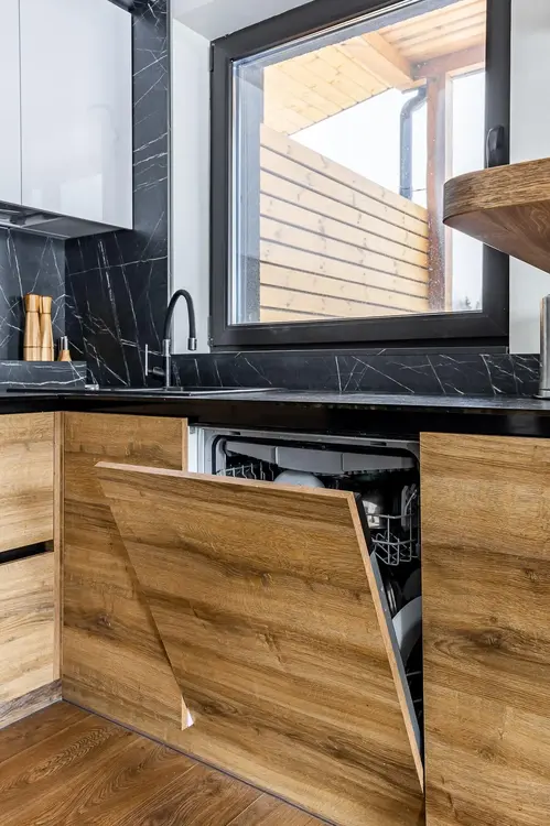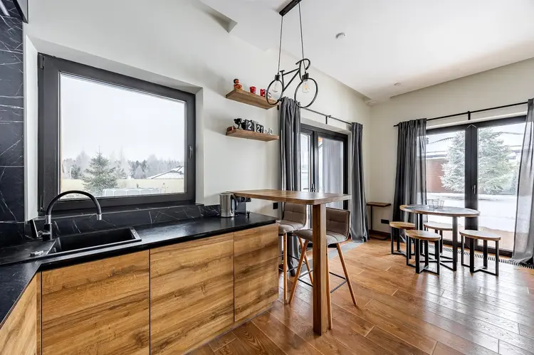 1 этаж - просторная кухня - гостиная с высотой потолка до 8 метров и панорамными окнами, санузел, прачечная.