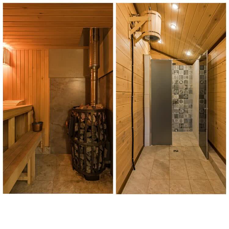 БАНЯ: Теплые полы. Отопление идет от дома под землей. В бане стоит термостат, чтобы поддерживать там нужную температуру;