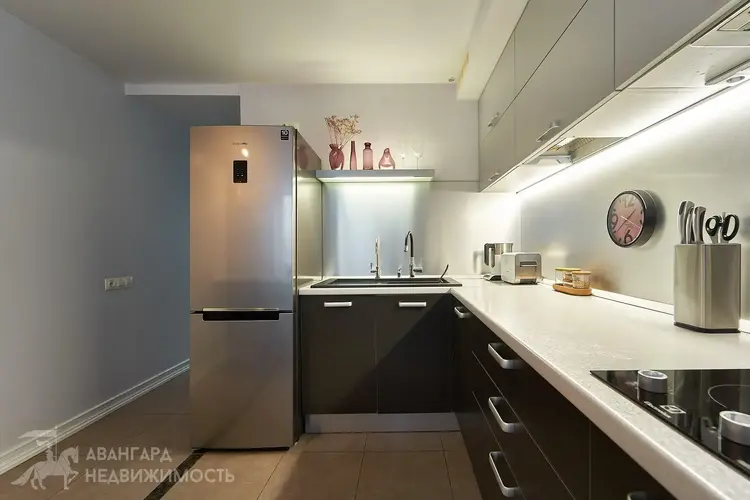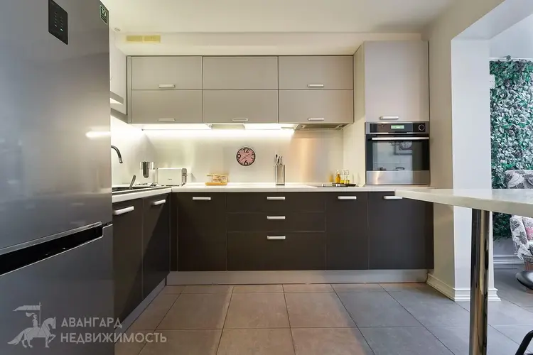 Большая кухня 9.2 м2 оборудована всей необходимой мебелью и техникой от ведущих мировых брендов, а ее размер и форма позволит вам проводить время всей семьей с комфортом. На полу и в рабочей зоне на стене уложена плитка.
