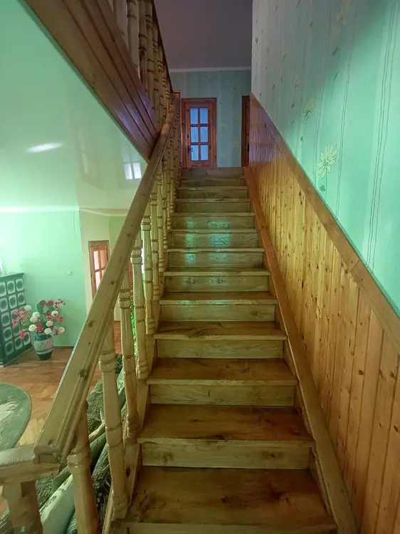 В доме имеется технический этаж, где расположены кладовая, котельная и гараж с ямой. На полу в доме уложен паркет, окна выполнены из ПВХ, натяжные потолки, установлены деревянные межкомнатные двери.