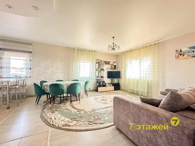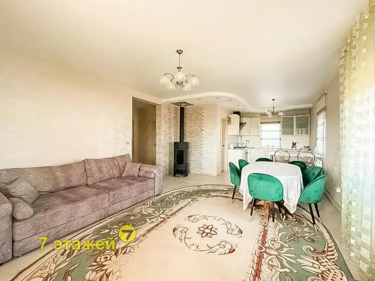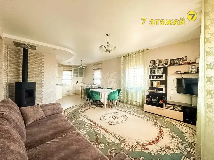 Кухня-гостиная 31,3 м2 просторная и уютная. Стоит просторный угловой диван и ТВ зона, обеденный стол для всей семьи, барный стол и кухонный гарнитур с встроенным духовым шкафом, газовой варочной панелью, вытяжкой. Установлен дополнительно камин для уюта и обогрева. В кладовой -котельной стоит холодильник, газовый котел, фильтры очистки и стеллажи.