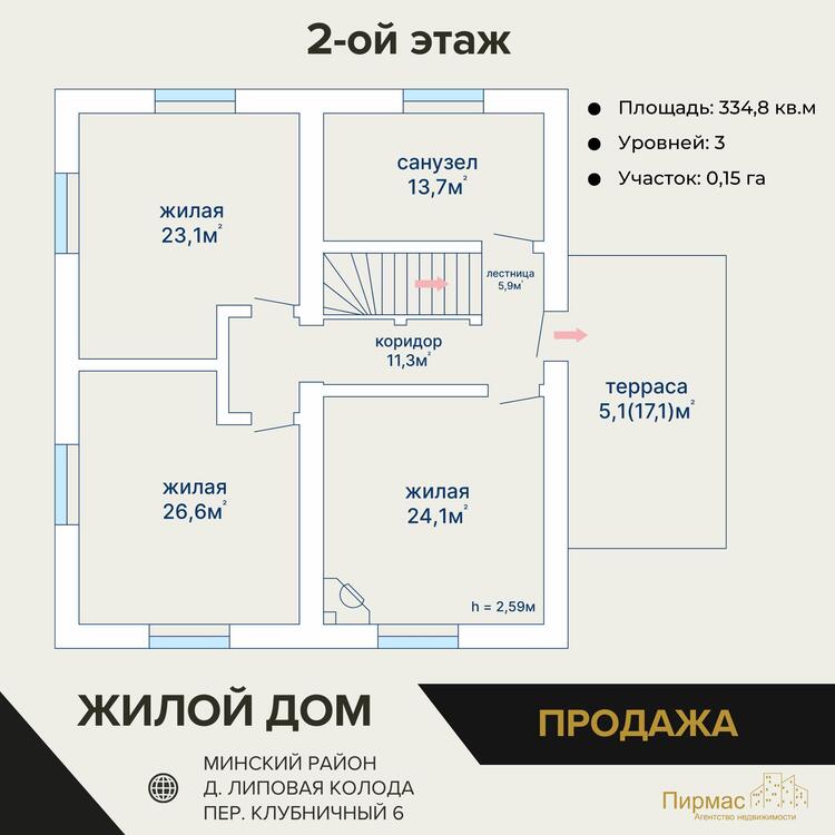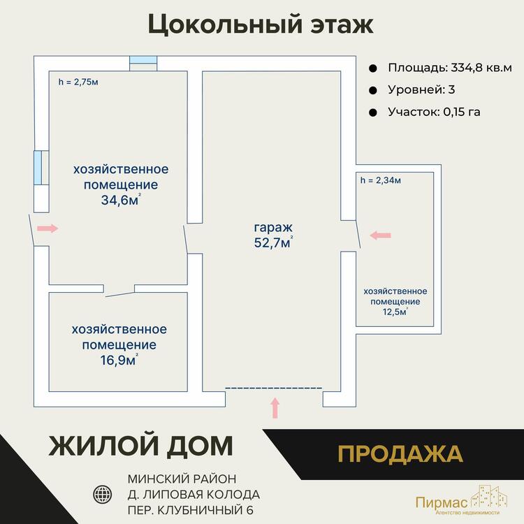 Этот просторный дом площадью 334,8 кв.м включает в себя три уровня: