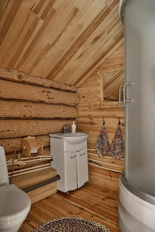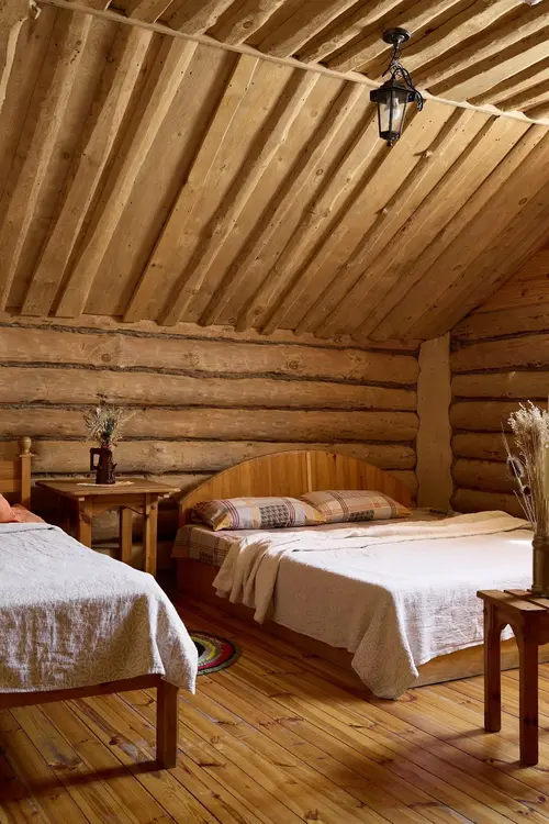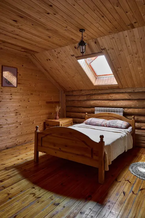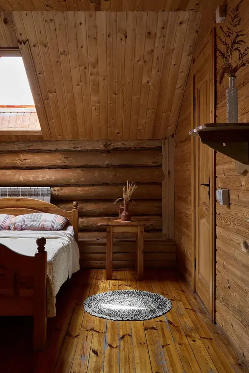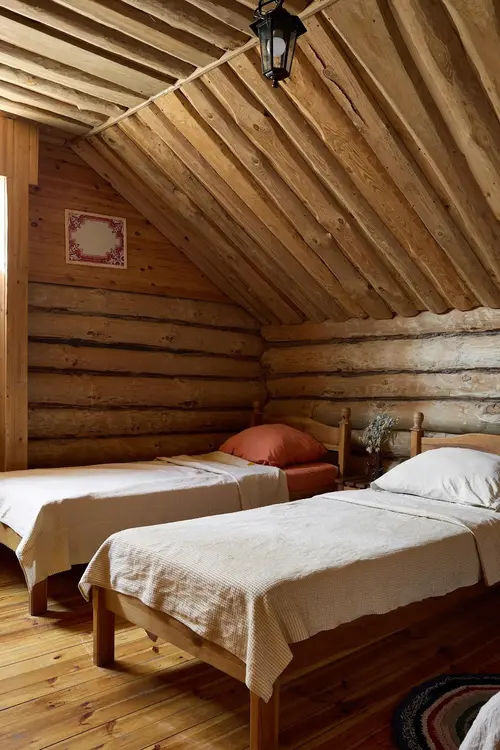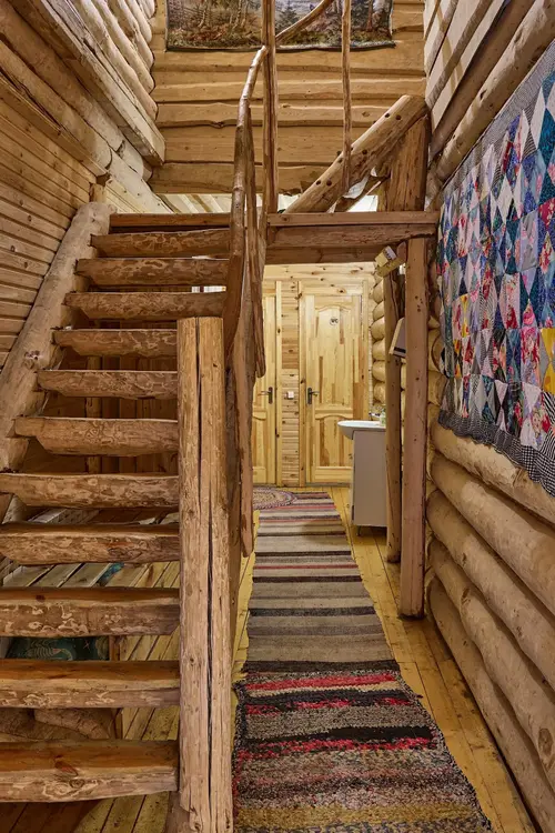 Второй этаж — шесть номеров, в каждой свой санитарный узел (унитаз, умывальник, душевая кабинка). Комнаты оснащены мебелью из дерева.