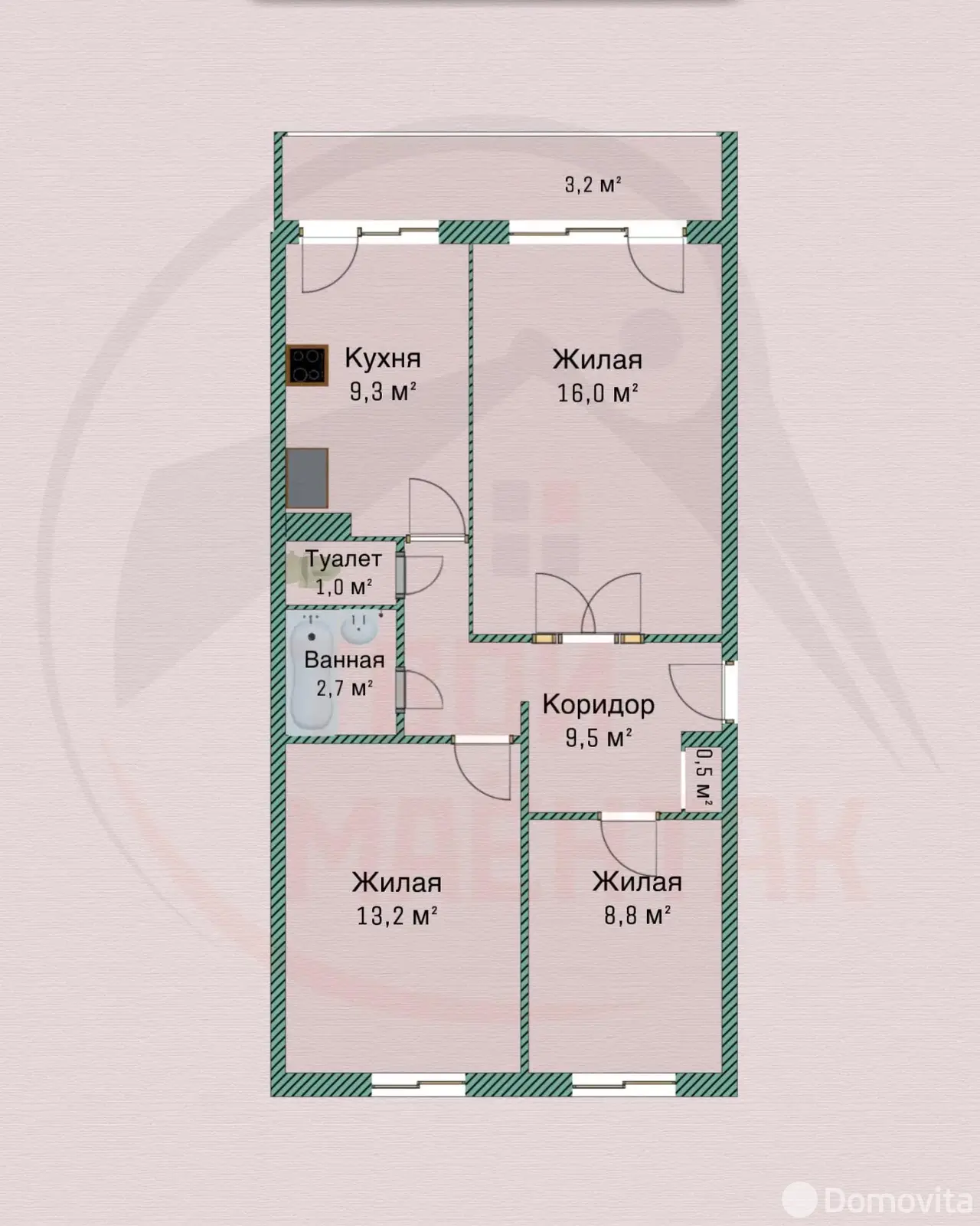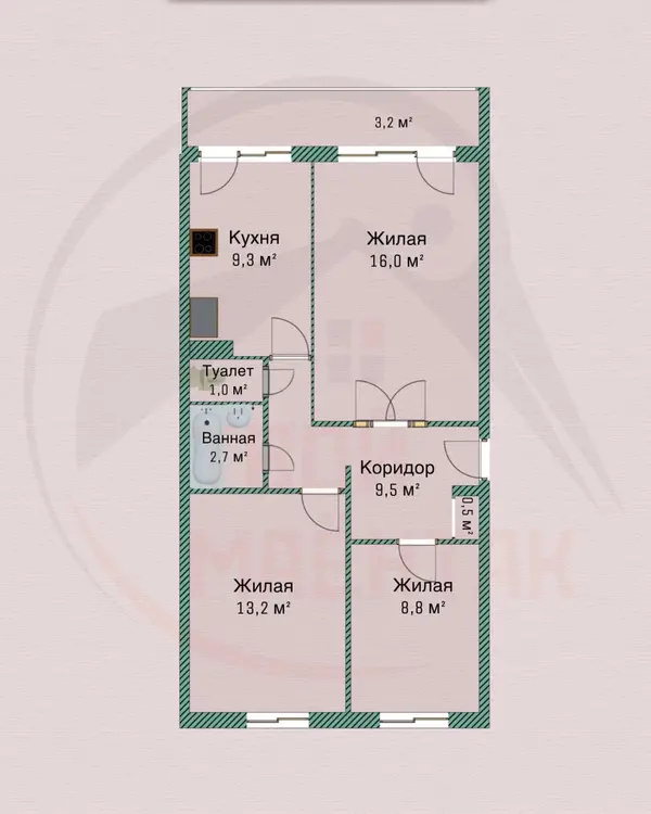 Площадь по СНБ – 64,2 кв.м., общая 61,0 кв.м., кухня – 9,3 кв.м.