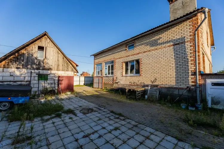 двух этажный блочный дом обложенный кирпичом с шиферной крышей полностью готов к круглогодичному проживанию.