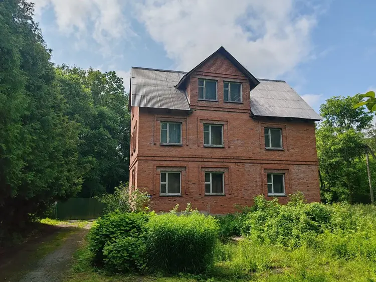 Кирпичный трехэтажный дом с просторным подвалом. Общая площадь 200 квадратных метров, жилая – 131. Крыша из шифера, перекрытия железобетонные.