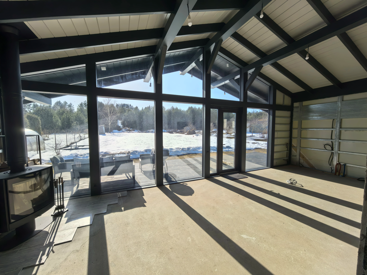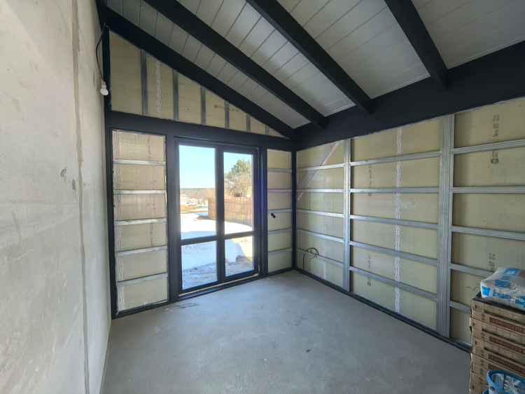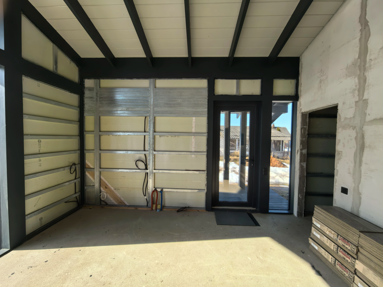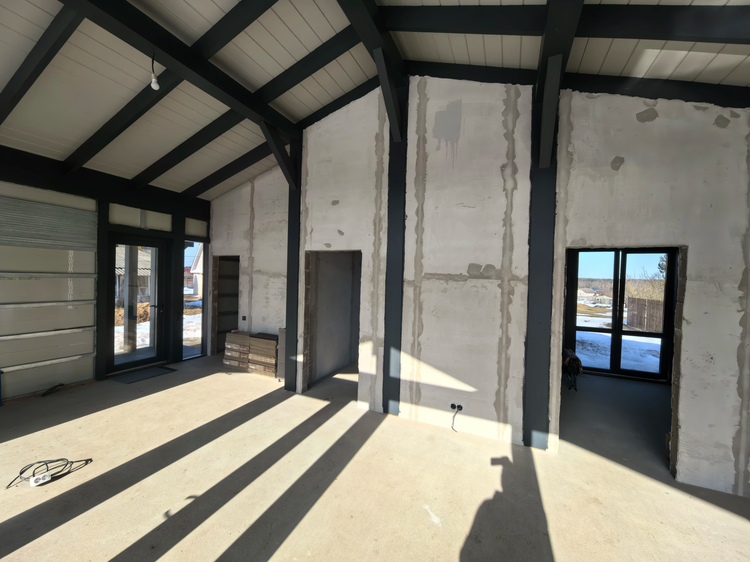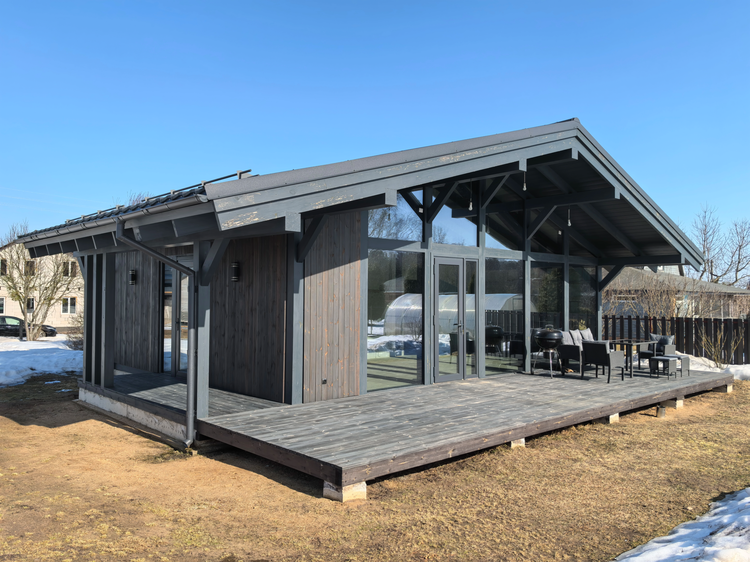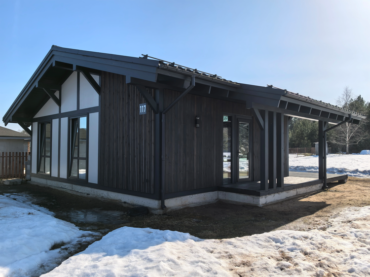 Фундамент: монолитная плита Планировка: большая кухня-гостиная с выходом на террасу, 2 жилых комнаты, топочная и санузел.