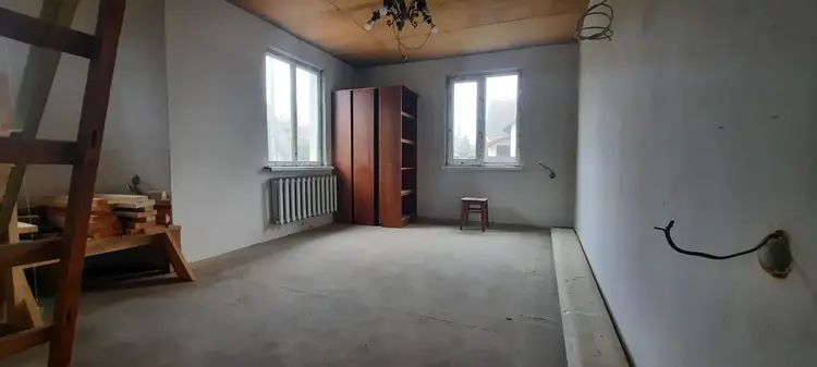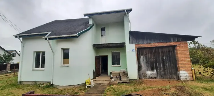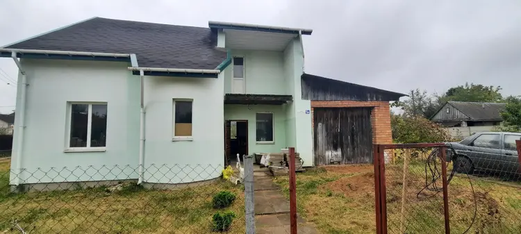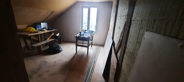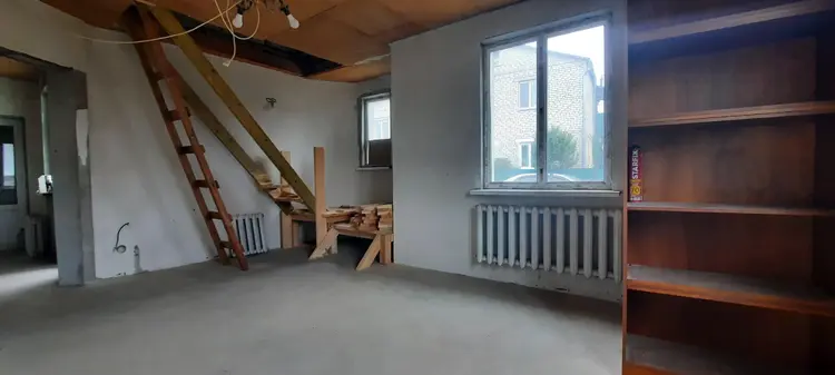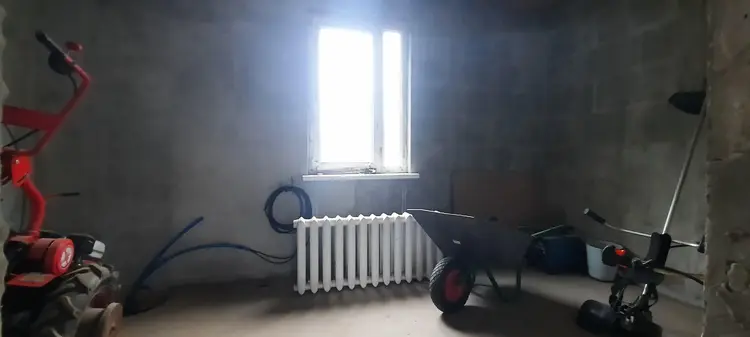 На первом этаже просторная гостиная, кухня 14м2, санузел. установлены стеклопакеты, выполнена стяжка, выровнены и прошпаклёваны стены, установлен новый двухконтурный газовый котел, закуплена керамическая плитка на кухню. На второй этаж ведет деревянная лестница (материалы закуплены), там расположены еще 3 комнаты. Потолки утеплены и подшиты дсп.