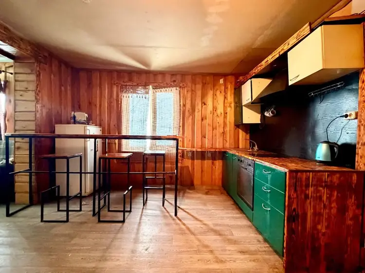 Внутренняя отделка выполнена со вкусом: стены обделаны деревом, потолки из гипсокартона, на полу уложен линолеум.