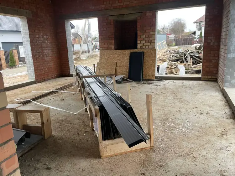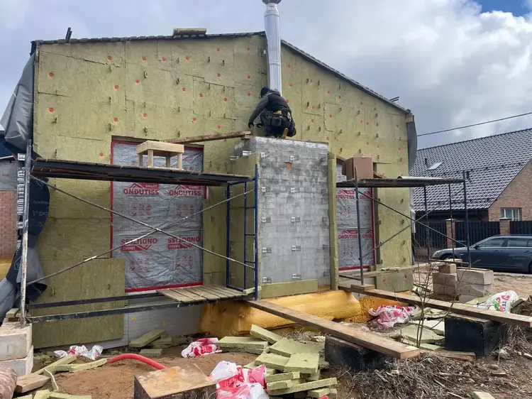 Дом построен из красного полого кирпича, утепление 100 мм, обрешетка металлическая под плитку или фальц. Остекление выполнено из алюминия, рамы черного цвета. Раздвижная беспороговая патио-система длиной 3 м. Все коммуникации выведены внутрь. Полная гидроизоляция цокольного этажа.