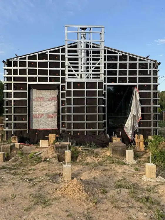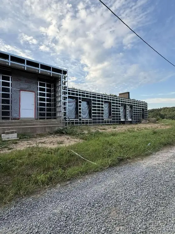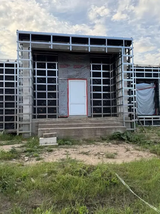 Куплены алюминиевые входные группы высотой 3,5 метра и все входные двери. На фасад выведена внешняя электрика. Газ согласован и доступен на участке. Электричество подведено.