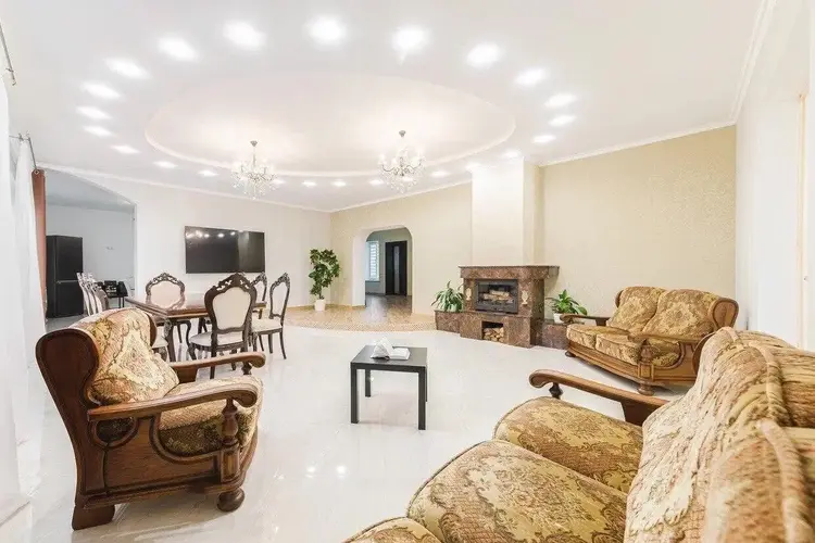 На первом этаже просторная гостиная с камином составляют единое пространство с кухней. Наш прекрасный функционирующий камин станет идеальным центром притяжения в вашей гостинной. Создайте незабываемые моменты с семьей и друзьями, наслаждаясь теплом и красотой этого уникального элемента интерьера. Мерцающий огонь, потрескивающие дрова и тепло, исходящее от камина, подарят вам ощущение спокойствия и безмятежности. Наслаждайтесь комфортом и гармонией в доме, которые дарит этот прекрасный элемент интерьера.