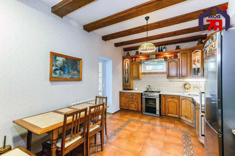 Внутри выполнен современный ремонт. Интерьер дома в классическом стиле, полы-дерево, благородные балки на потолке, эксклюзивная мебель, а также камин в гостиной для уютных вечеров.