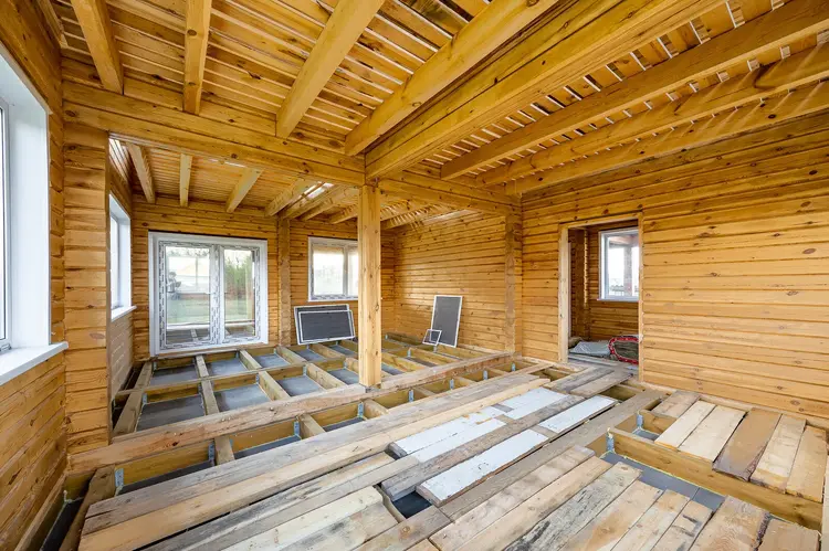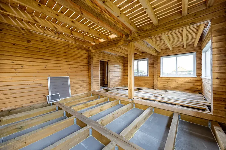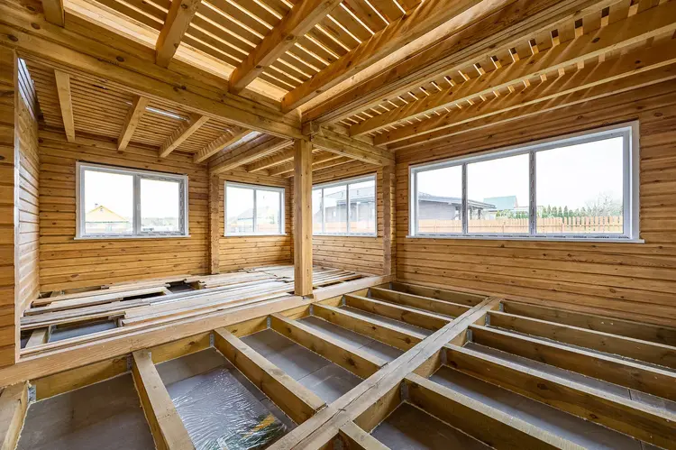 Готовность основного дома примерно 85 %: полностью готовы внутренние стены, осталось положить пол и потолок. Есть помещение внутри дома, предусмотренное под баню.