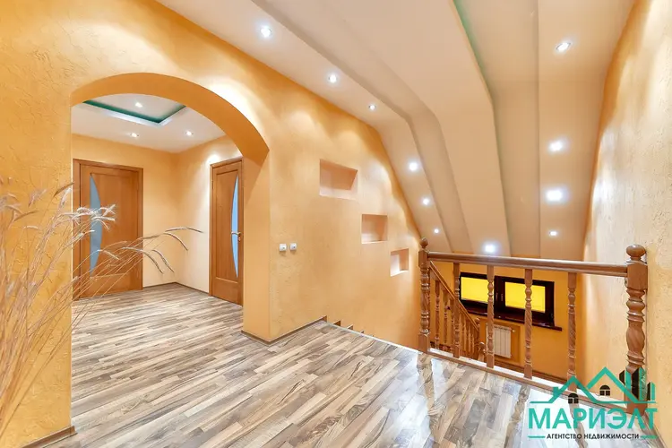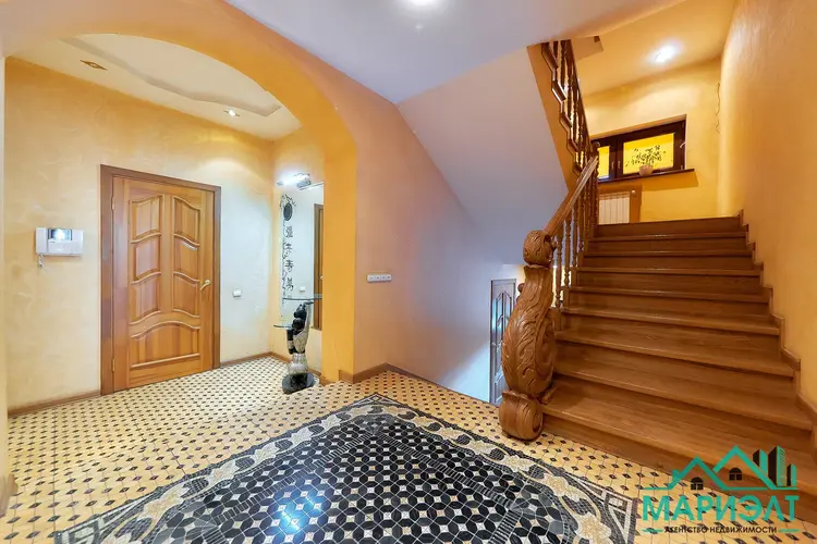 В доме 6 жилых спален, гостиная, 3 сан. узла, бильярдная, прачечная, спортивный зал, 2 гаража с ямой, кладовые, сауна с бассейном.