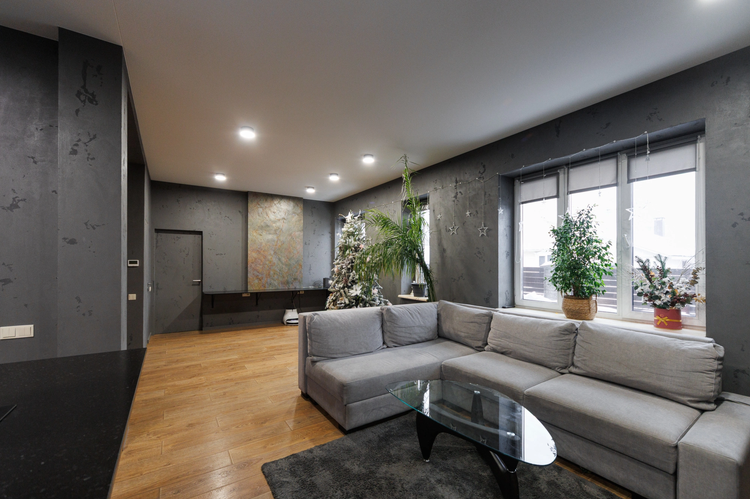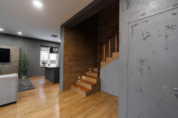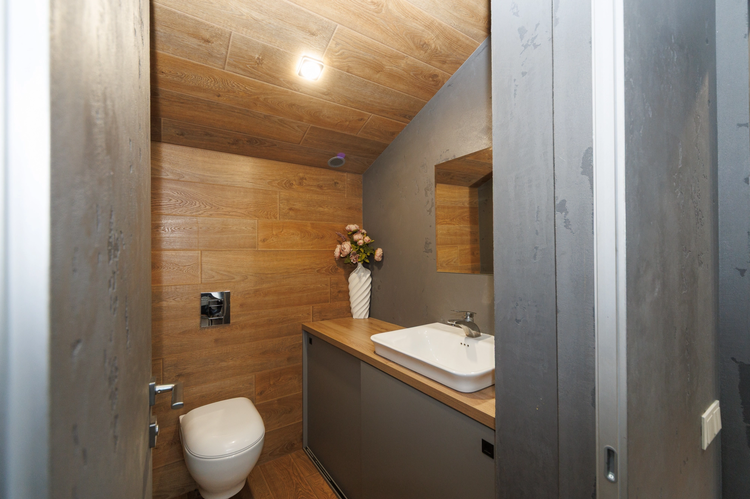 Парящие потолки, двери со скрытым коробом, утепленные стеклопакеты, плитка в декоре “под дерево”, лестница на металлокаркасе, ступени – натуральное дерево, по всему дому установлены радиаторы.