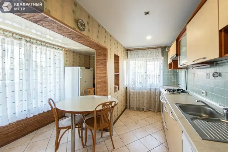 Кухня – светлая, просторная и функциональная, оборудована гарнитуром, отдельно стоящей газовой плитой. Большое окно обеспечивает хорошее естественное освещение.