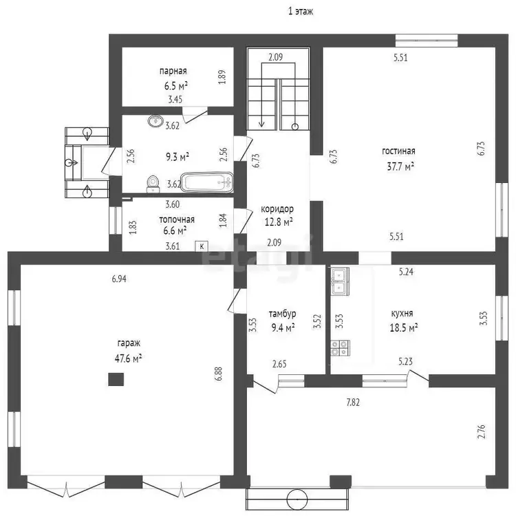 На первом этаже расположены просторная гостиная 37.7 м.кв. с огромными панорамными окнами, позволяющими наслаждаться великолепными пейзажами, и камином, создающим атмосферу уюта. Современная кухня 18.5 м.кв, оснащенная высококачественной встроенной техникой, подойдет как для кулинарных экспериментов, так и для приемов гостей: холодильник Liebherr, электрическая варочная поверхность, духовой шкаф и СВЧ печь AEG, посудомоечная машина Siemens, кофемашина Delonghi. С/у 9.3 м.кв., сауна 6.5 м.кв. с выходом в закрытую террасу с купелью. Отапливаемый гараж 47.6 м.кв. на 2 автомобиля с выходом в дом.