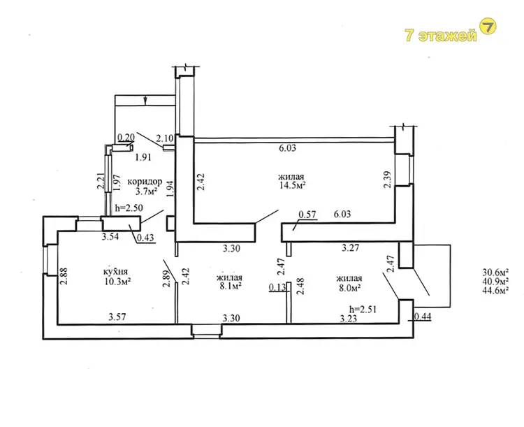 Общая площадь по СНБ 44,6 кв.м., общая площадь 40,9 кв.м., кухня 10,2 кв.м.