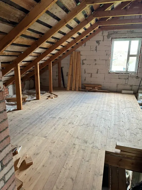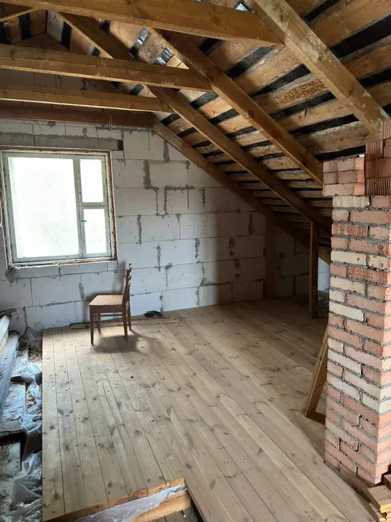 Параметры дома позволяют сделать очень привлекательную квартиру, кроме большого цокольного этажа (хозяйственное помещение 27,5 кв.м., котельная 17,6 кв.м.), первого – 43,0 кв.м., есть еще и мансардный этаж.