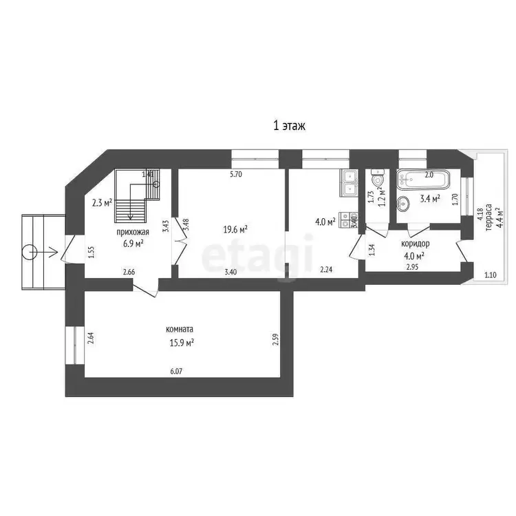 Общая площадь квартиры по СНБ составляет 149,8 м2. На первом этаже квартиры расположена просторная кухня-столовая и изолированная жилая комната 15,9 м2, а также раздельный санузел. На втором этаже – жилая комната 27,3 м2, две отдельных комнаты площадью 17,0 и 10,5 м2, а также застекленная лоджия и веранда 14,3 м2. На третьем уровне квартиры в мансардном этаже расположена летняя комната.