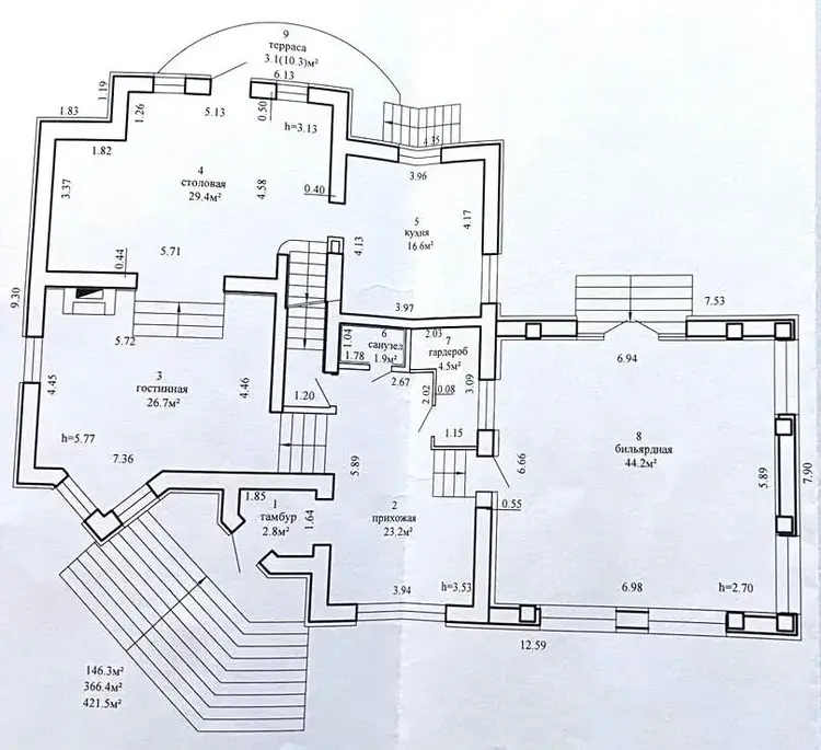 Общая площадь по СНБ 699,7 кв.м., жилая 190,4 кв.м (380,8 кв.м.). Кухня 39,6 кв.м.