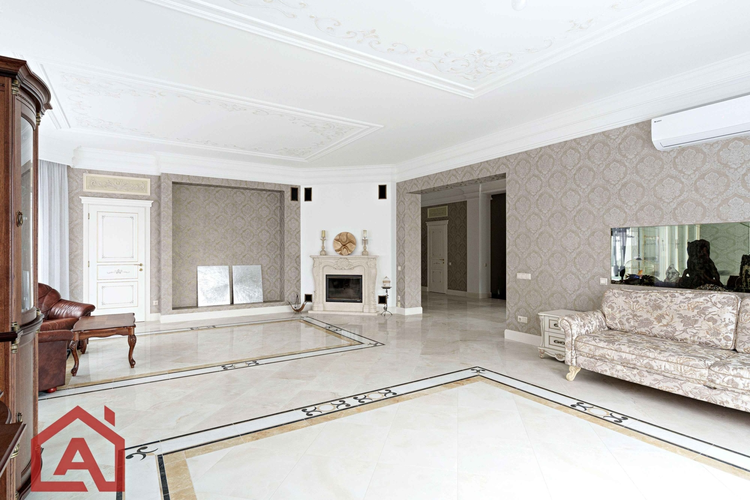 Теплые полы, паркетная доска. В санузлах плитка Сквирелл, на стенах итальянские обои, ручная роспись потолков и стен. Шикарная лестница с дубовыми ступенями, двери производство Италия.