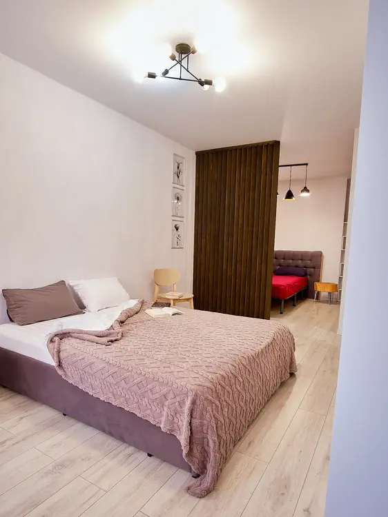 Спальня-2 двуспальные кровати разделены дизайнерской перегородкой.