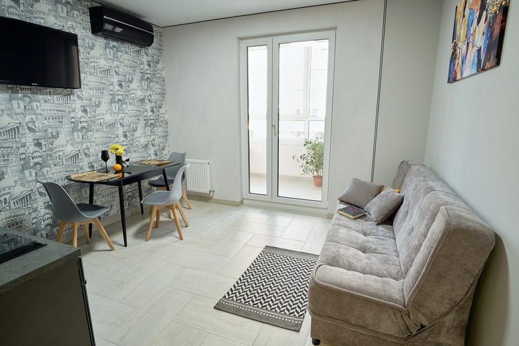 Кухня гостиная с современной новой бытовой техникой, холодильник , индукционная плита, электрочайник, СВЧ печь, духовой шкаф, посудомоечная машина, бесшумный кондиционер, телевизор Smart, (приложение ZaLa), безлимитный интернет 2.4, 5 g скорость 200 Mбит.Кухня укомплектована всем необходимым для приготовления.