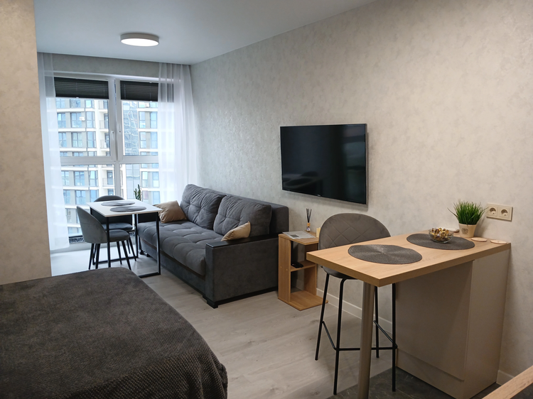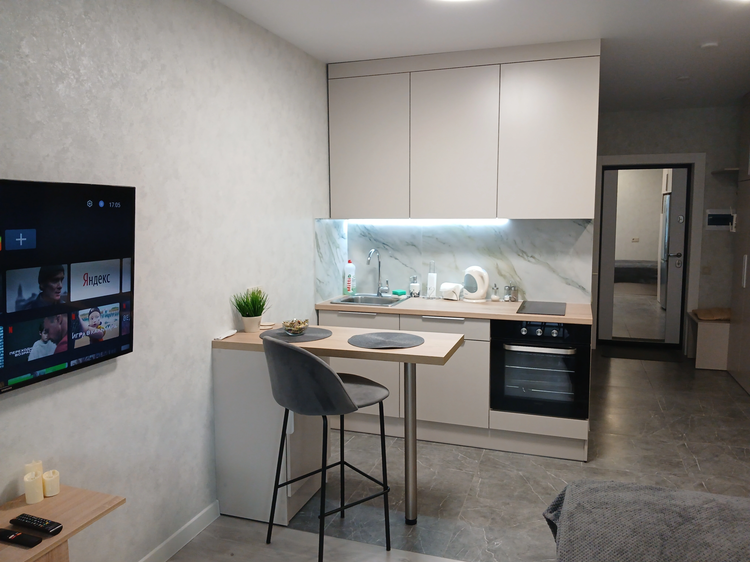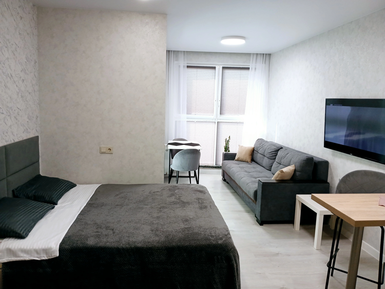 В студии есть всё необходимое для проживания и отдыха - мебель, посуда, телевизор с IPTV (более 5000 каналов - кинозалы,премьеры,музыка, спорт, 18+) и SMART TV, Wi- Fi, холодильник, свч-печь, чайник, утюг, фен, стиральная машина, бойлер, белье/полотенца, чай/кофе. Спальных мест 2+2.