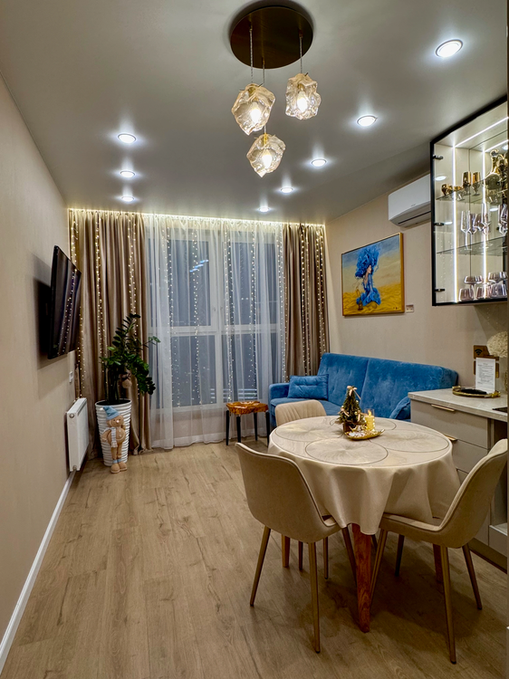 — Уютный интерьер, новая мебель: диван-кровать,кондиционер,стиральная машинка,кухня с техникой и посудой;