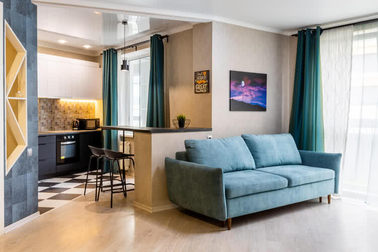 В наших апартаментах выполнен современный ремонт в соответствии с последними модными тенденциями. К Вашим услугам предоставляется уютная гостиная с мягкой мебелью и ЖК-телевизором, объединенная с функциональной кухней. Имеется посудомоечная машина, вся необходимая мебель, микроволновка, холодильник, электрочайник, посуда для приготовления пищи. Светлая спальня с большой кроватью и телевизором подарит Вам тепло и уют домашнего очага. Для Вашего комфорта мы предусмотрели наличие некоторых приятных мелочей: безлимитный интернет Wi-Fi, бойлер, средства личной гигиены, полотенца, фен, утюг, гладильная доска, кофе-чай и чистая питьевая вода.