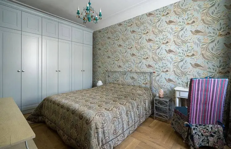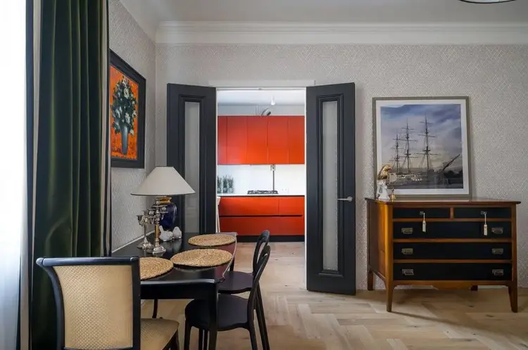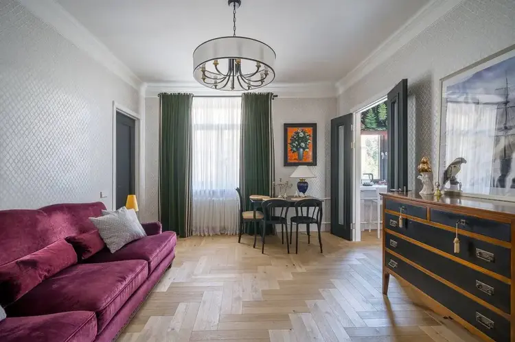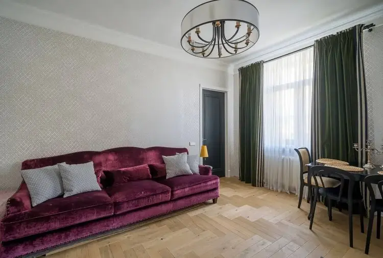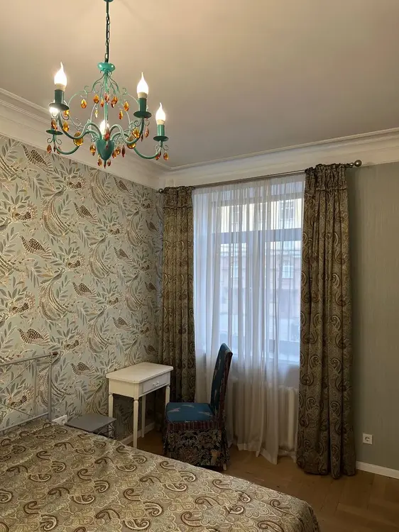 В квартире трёхметровые потолки, большие окна, итальянская мебель и освещение, на полу лежит паркетная доска. Сделан дизайнерский ремонт в стиле неоклассика.