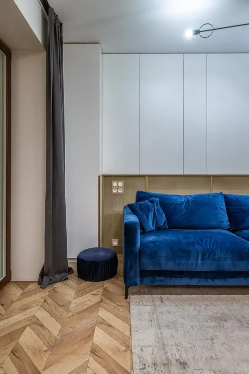 На кухне в зоне с повышенной влажностью и в прихожей выполнена укладка керамогранита Stargres Woodland Brown, органично переходящего в ламинат Kaindl Natural Touch Wide Plank Дуб Рочеста, которым покрыт пол по всей квартире.