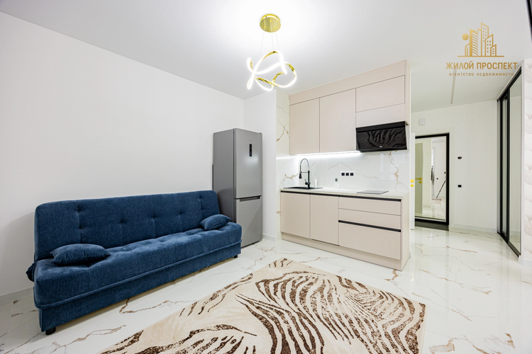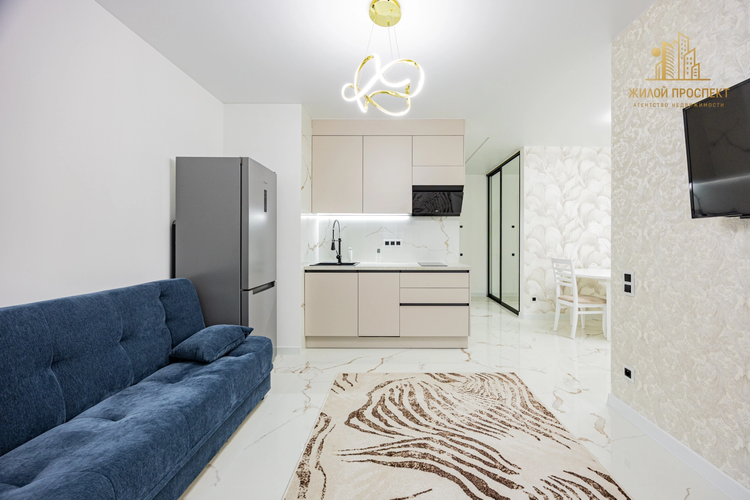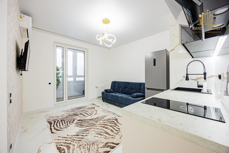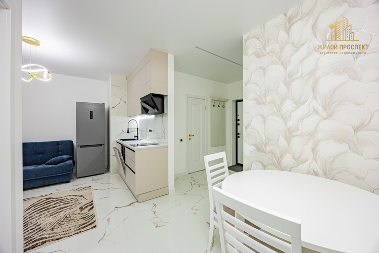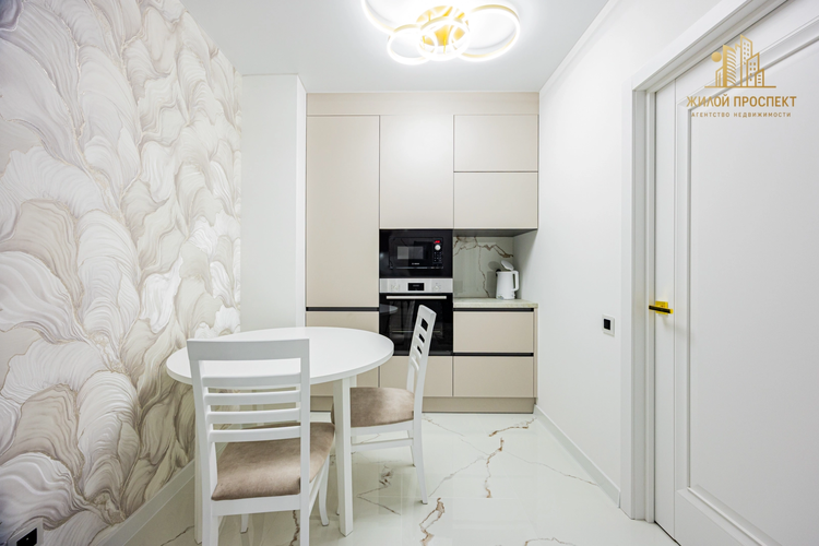 Квартира выполнена в светлой спокойной гамме с использованием качественных материалов. Кухня оформлена элегантными фасадами. В санузле установлена надежная сантехника и современное зеркало с подсветкой. При входе обустроена удобная гардеробная.