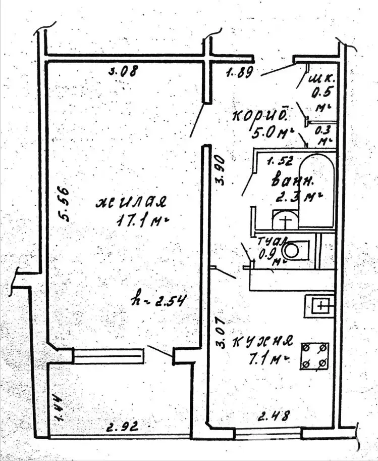 Общая площадь квартиры (СНБ) – 33,2 м2; жилая – 17,1 м2; кухня – 7.1 м2; высота помещений – 2,55 м2.
