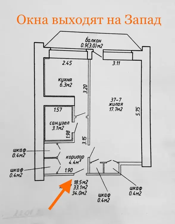 Площадь по СНБ: 34 КВ.МЕТРОВ, но балкон фактически 3 метра