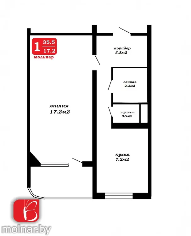 Квартира расположена на восьмом этаже девятиэтажного дома. Общая площадь по СНБ — 35,5 м², жилая — 17,2 м², кухня — 7,2 м². Окна выходят на восточную сторону, что обеспечивает приятное утреннее освещение.