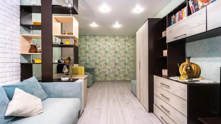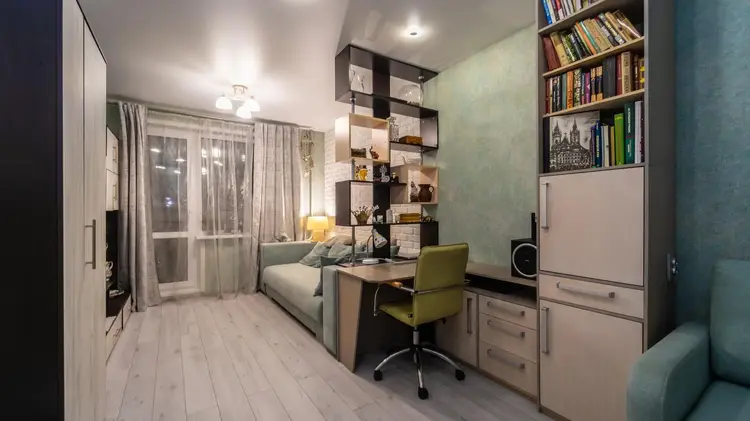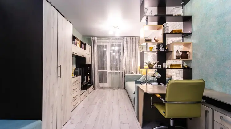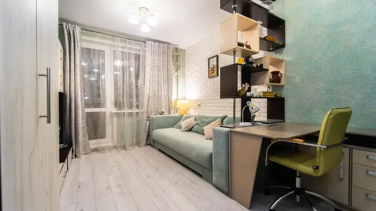 Комната удобно разделена на приватную зону отдыха и рабочую зону.