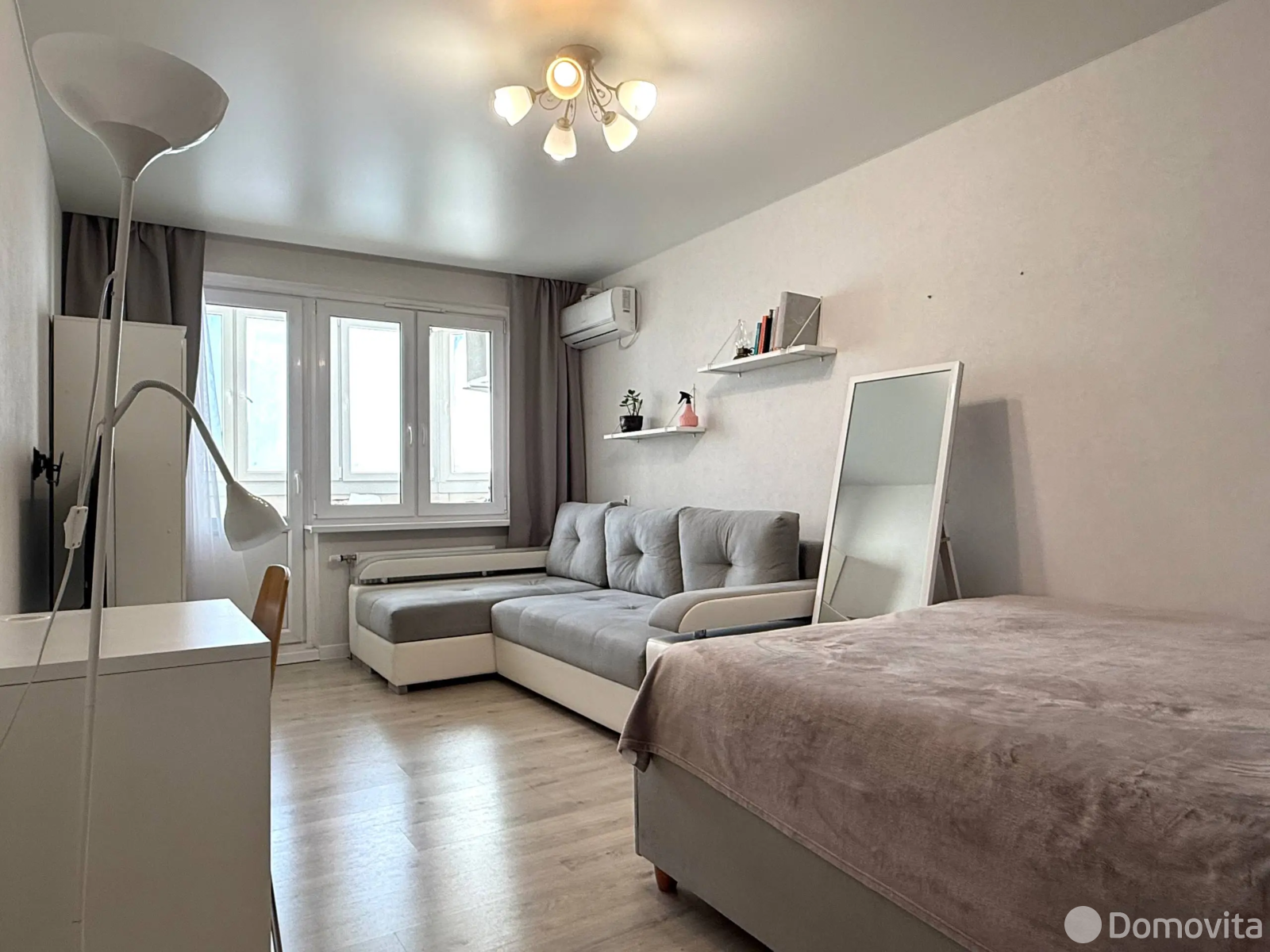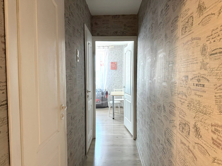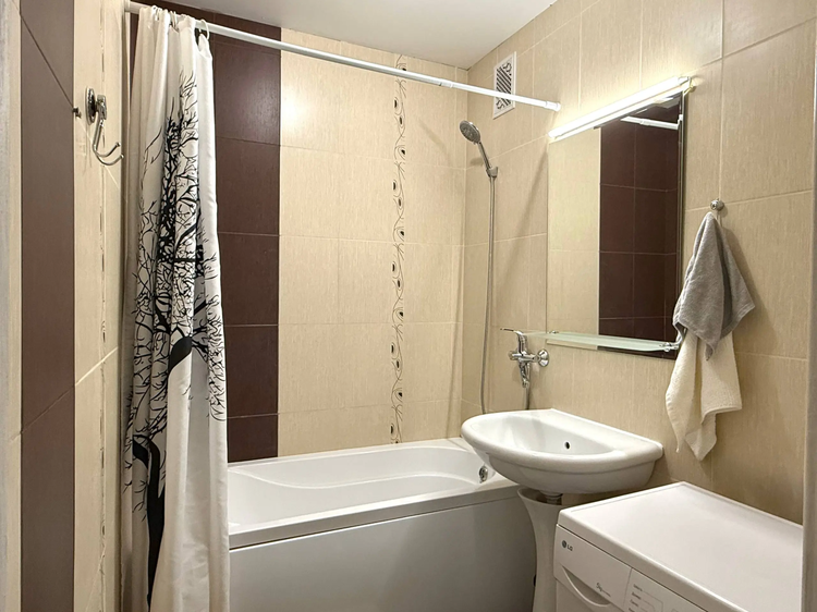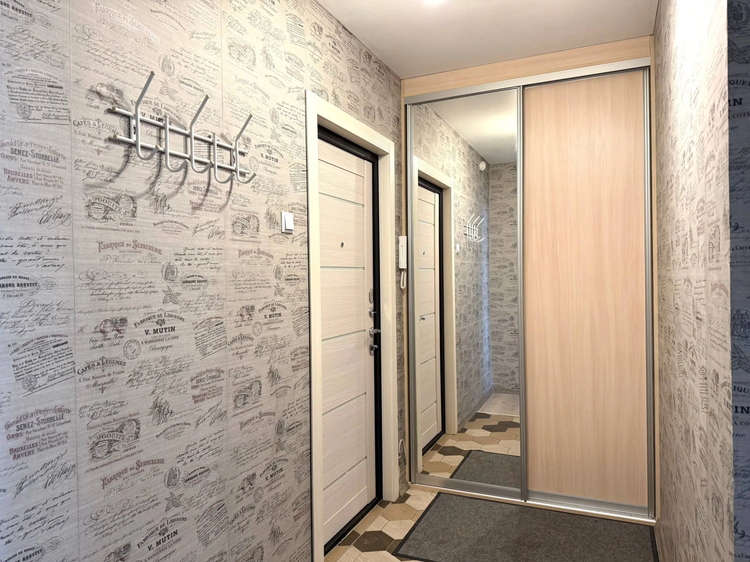 Выполнена качественная отделка: напольное покрытие — ламинат, в комнате натяжной потолок. Установлены шкаф-купе, кондиционер, электроплита. Раздельный санузел облицован плиткой, акриловая ванна. Проведено оптоволокно и интернет. Тамбур на две квартиры.