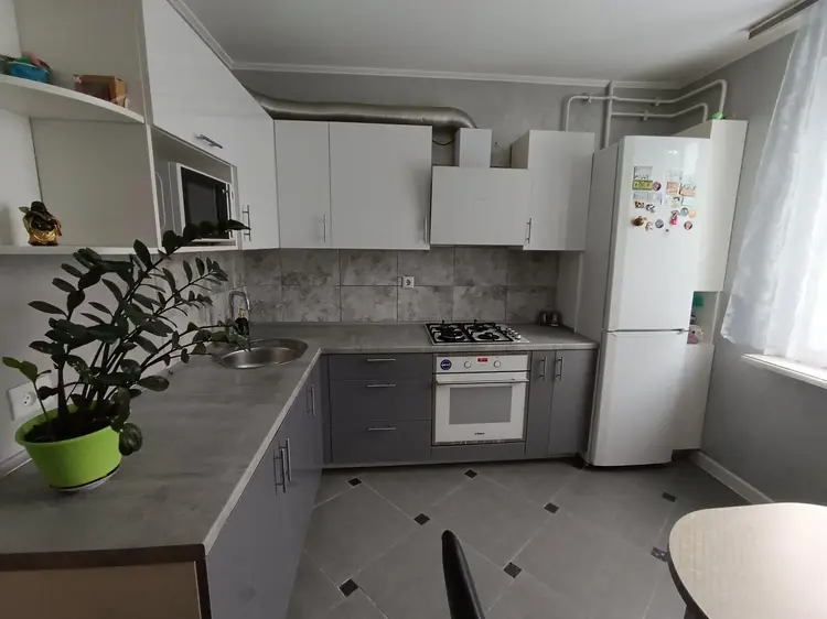 -Кухня 9.2 кв.м имеет достаточно места для хранения, удобную рабочую поверхность и оснащена газовой поверхностью, электрическим духовым шкафом,холодильником и вытяжкой.