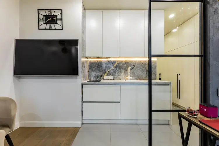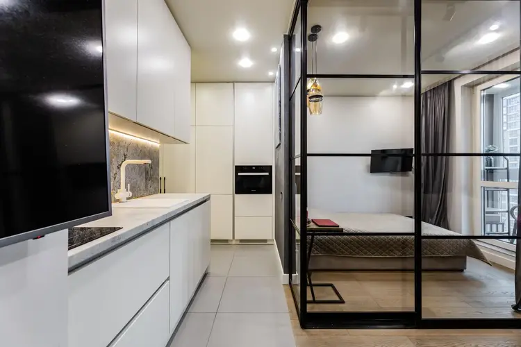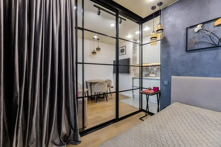 -В квартире сделан современный ремонт. Использованы только качественные материалы. Всё сделано со вкусом. Освещение в квартире очень продуманное с разными сценариями. Для хранения всего необходимого есть шкафы.