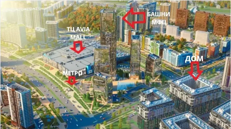 Зеленая парковая зона, международный финансовый центр и крупнейший торговый центр Авиа Молл в центре комплекса.