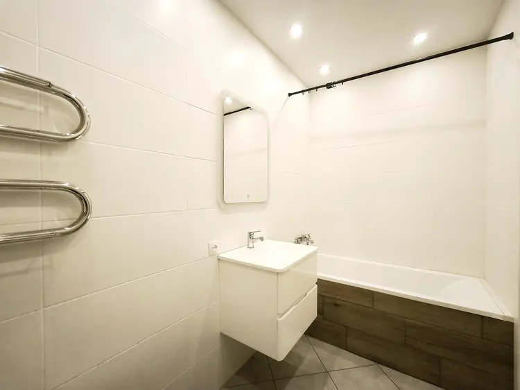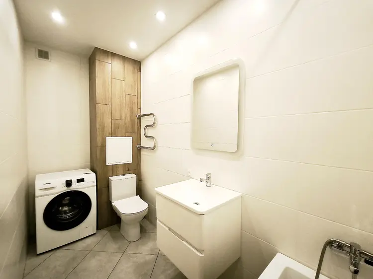 Сан узел с мебелью, сантехникой, стиральной машиной SAMSUNG, оборудован ванной. Отделка плиткой, зеркало с интерьерной подсветкой, большой умывальник с тумбой.