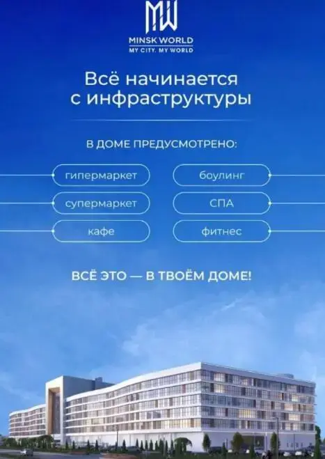В пешей доступности будет вся собственная инфраструктура Minsk World – взрослая и детская поликлиника, медицинский центр, кафе и магазины, парковки, спортивные залы и фитнес-центры.